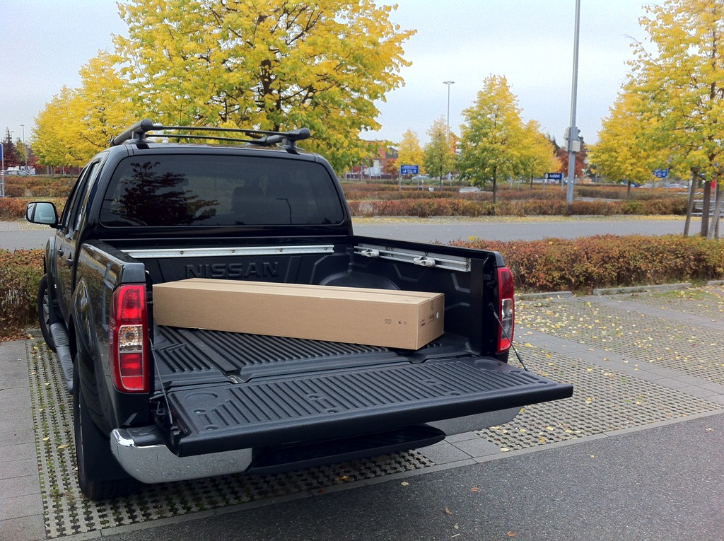 Auf der Packung steht als Piktogramm: Nur zu zweit tragen. Glückwunsch, bin alleine unterwegs. Bleischwer das Ding. Auf den Einkaufswagen wuchten ging ja noch, aber jetzt muss ich damit rund 1 m Höhenunterschied zur Ladefläche des Nissan ausgleichen. Gut, dass der Nissan einen Ladekantenschutz hat. Und diagonal geht die Packung sogar drauf! Schön, dass es nicht regnet. Eine Plane wäre dann nicht schlecht gewesen. Im Zubehör bei Nissan gibt es sogar ein Hardtop für rund 2.500 Euro. Oder ein Campingzelt für die Ladefläche (rund 323 Euro). Kein Scherz. Könnten wir heute Nacht doch am See campen. Blöd, jetzt ist das Bier schon weg. Also Regal nach Hause bringen und gut.