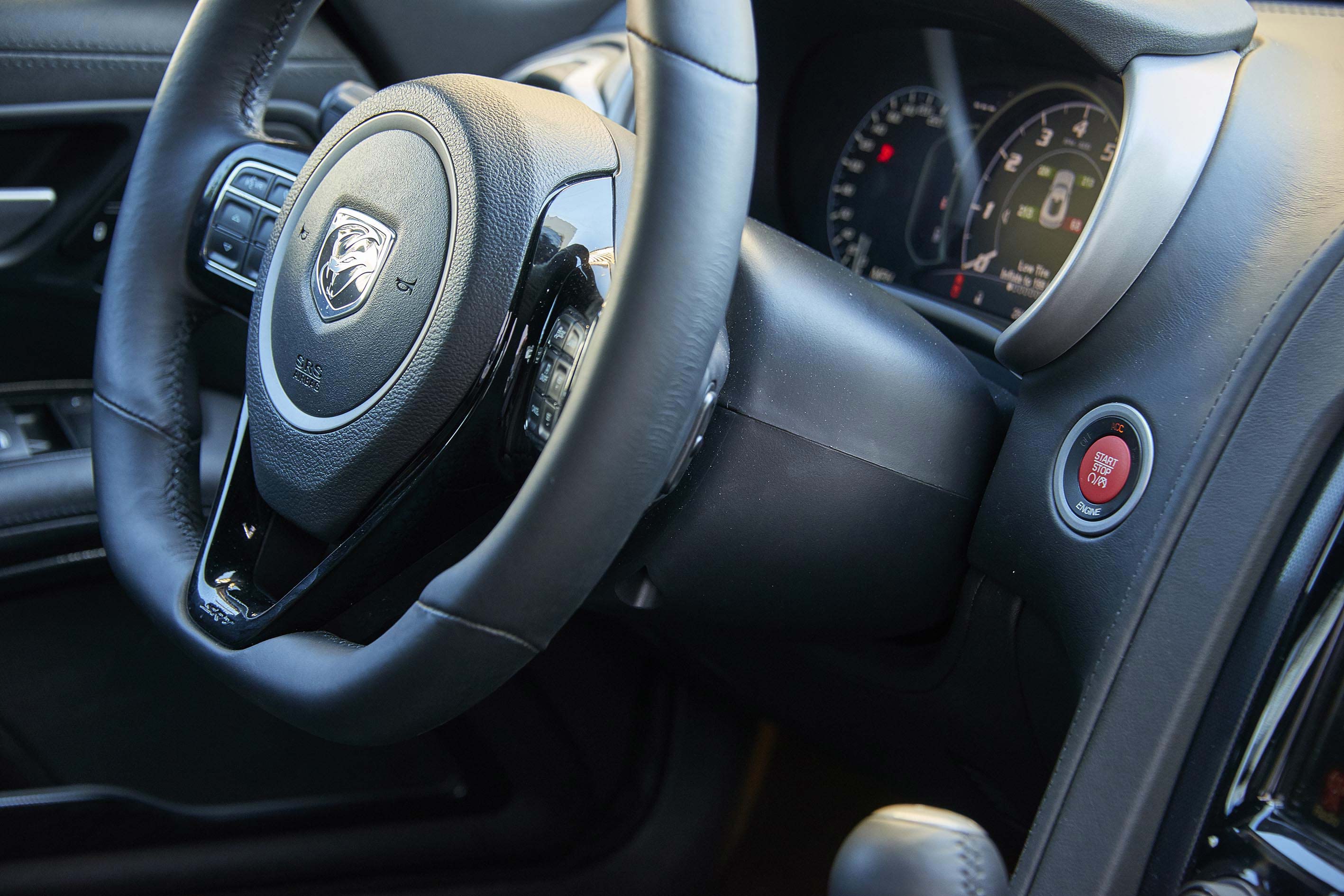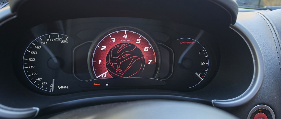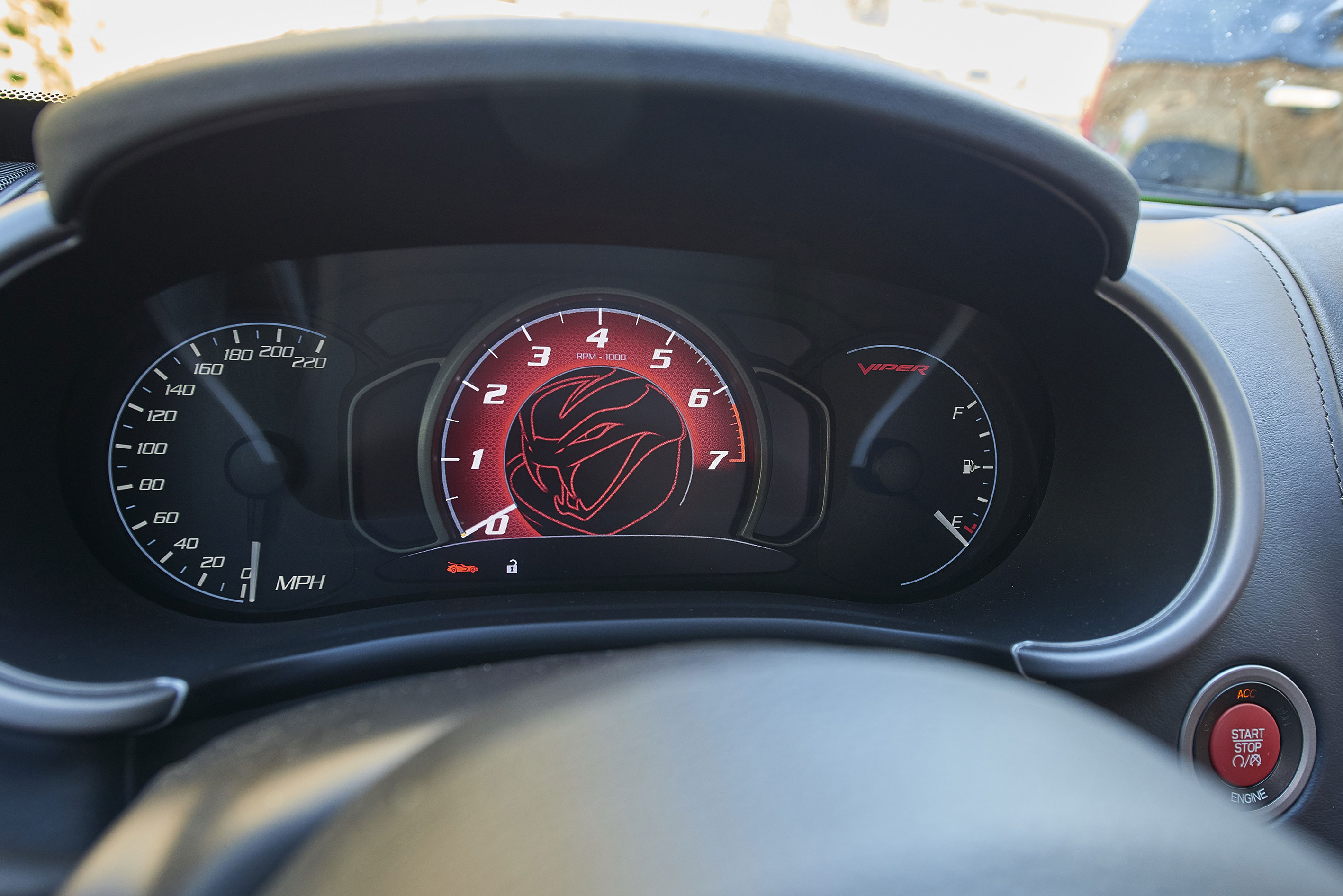 Eng ist Sie und ich habe mit 1,92m Körpergröße zumindest ein wenig Mühe in Sie hineinzugleiten. Die alte Viper hatte im Dach Tunnel artige Ausbeulungen, damit Fahrer mit Helm obenrum besser Platz finden. Diese in reduzierter Form zwar auch, dennoch stoße ich mich in der Neuen regelmäßig mit der Cap an der Sonnenblende über mir und muss eher eine nach vorne geneigte Haltung einnehmen. So what! Innen Alupedale, ein kurzer Schaltknüppel und – für Amikisten eher selten – Leder wohin das Auge blickt, sogar auf dem Armaturenbrett. Die Sitze bieten angenehmen Seitenhalt und sind erfreulich straff gepolstert. Da hat sich wirklich einiges getan die letzten Jahre bei unseren amerikanischen Freunden. Das relativ dicke Multifunktions-Leder-Sportlenkrad liegt perfekt in der Hand und ist unten abgeflacht. Klavierlack und mattsilberne Elemente tragen zum allgemein recht wertigen Cockpiteindruck bei. Die Haptik stimmt ansonsten durchaus. Der Viper Schlüssel kann, Dank Keyless-Go, getrost im Täschchen stecken bleiben. Gestartet wird das Biest über einen roten Startknopf, der ein wenig an diese Atombombenstartknöpfe im Koffer aus einem Action-Blockbuster erinnert. Man zuckt kurz zurück und fragt sich unbewusst, ob man es wirklich tun will/ sollte/ darf…